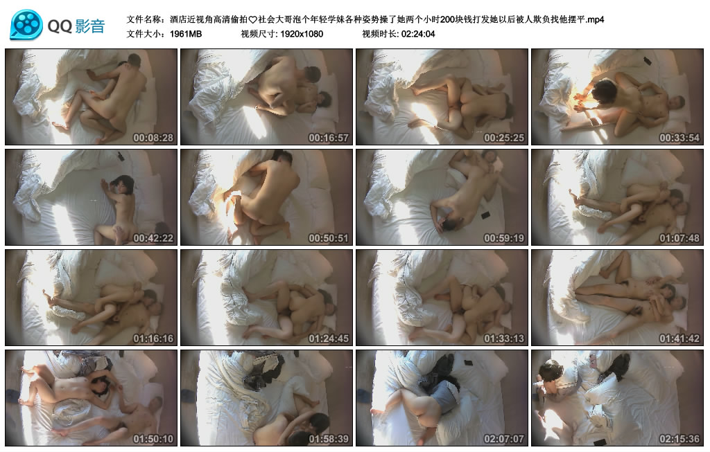 【影片名称】:酒店近视角高清偷拍❤️社会大哥泡个年轻学妹各种姿势操了她两个小时200块钱打发她以后被人欺负找他摆平[MP4/1961MB] 【影片格式】:MP4 【影片大小】:1961MB 【影片时
